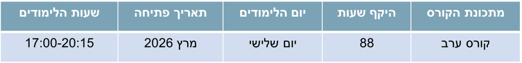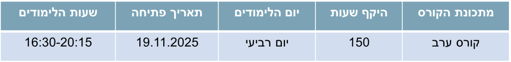 • הכשרה מקצועית ממוקדת בשנה אחת בלבד – מתכונת לימודים נוחה ומיטבית, מפגש אחד בשבוע בשעות אחר הצהריים.