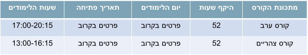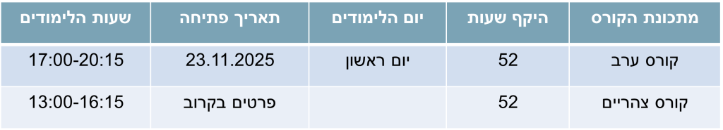 - הקורס מתקיים בשני מסלולים – מסלול בוקר ומסלול ערב.